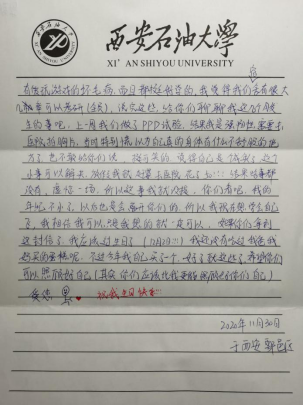 公司2020级辅导员李昱昊在总结活动时强调:社会在不断发展,时代在不断进步。越来越多的人通过语音视频等方式向亲人表达问候,但其实这种方式会有许多感恩的话语难以用语言表达,本次活动旨在于引导大家通过传统的书信加深与父母及亲友的情感沟通,培养大家的感恩意识、责任意识、自立意识和健全人格,为大家的成长成才提供更大帮助。